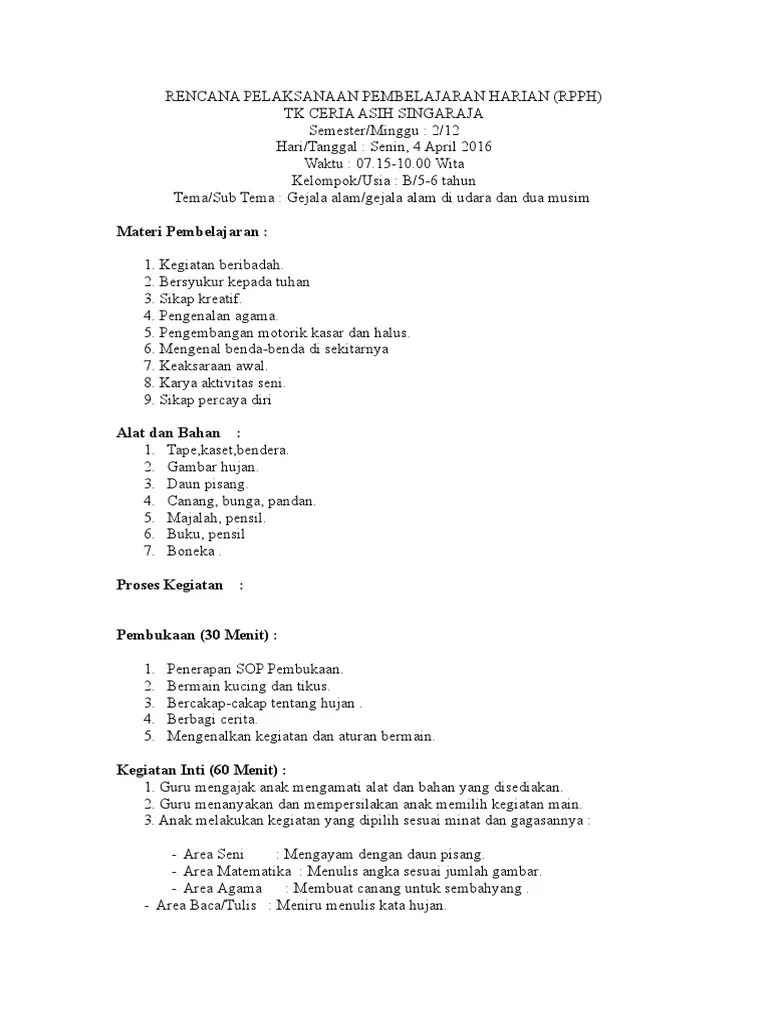 Macam gejala alam hari tujuan strategi pembelajaran kd cakupan. Contoh rpph kelompok usia 4 5 tahun tema negaraku dan alam rpph paud tema. Contoh rpph paud/tk b tema alam semesta/ gejala alam/ bintang kurikulum 2013. Rpph paud tema alam semesta subtema gejala . Tema/sub tema/sub sub tema :